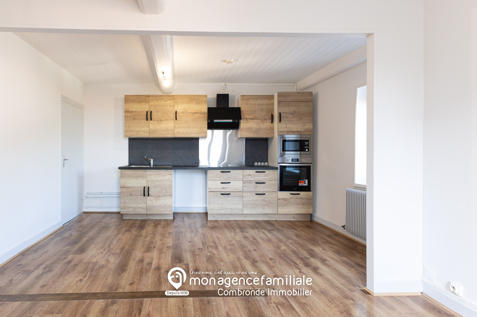 Ce logement se compose d’une entrée avec un espace buanderie, d’une cuisine aménagée et entièrement équipée (plaque de cuisson, hotte, four et micro-ondes) ouverte sur un agréable séjour, de trois chambres ainsi que d’une salle de bain.