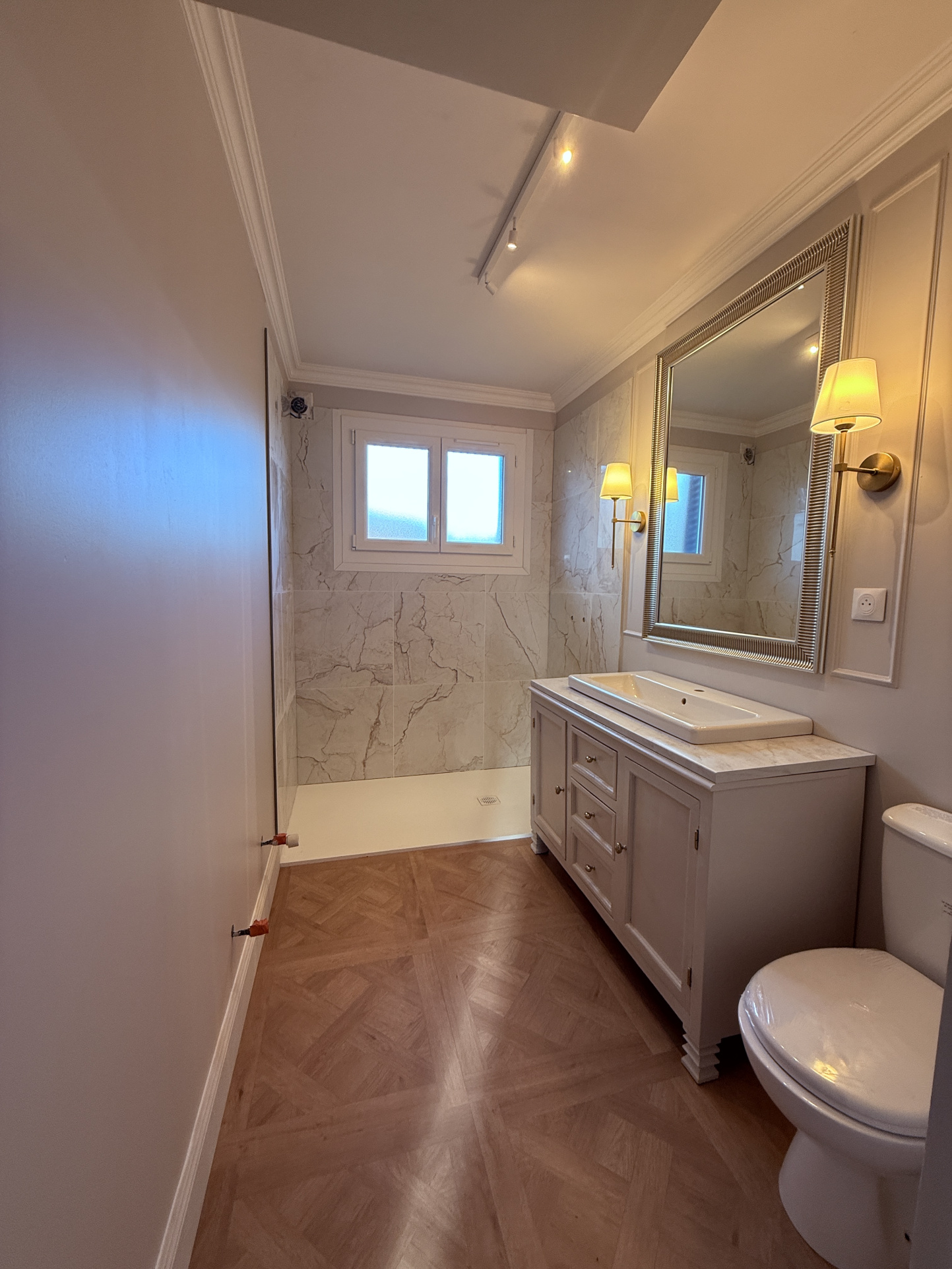 Au rez-de-chaussée, vous trouverez une entrée ouvrant sur un grand séjour lumineux, ainsi qu’une cuisine en cours d’aménagement.